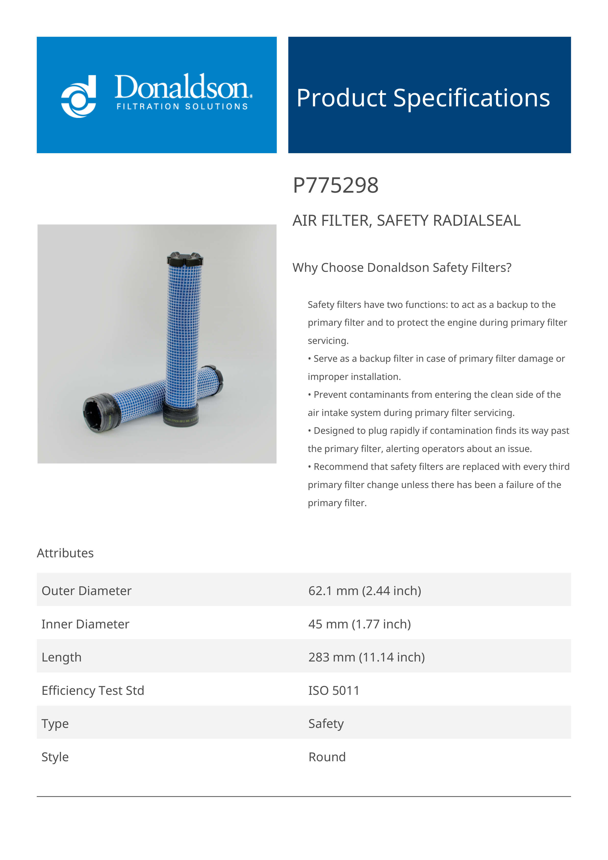 Why Choose Donaldson Safety Filters?Safety filters have two functions: to act as a backup to the primary filter and to protect the engine during primary filter servicing.