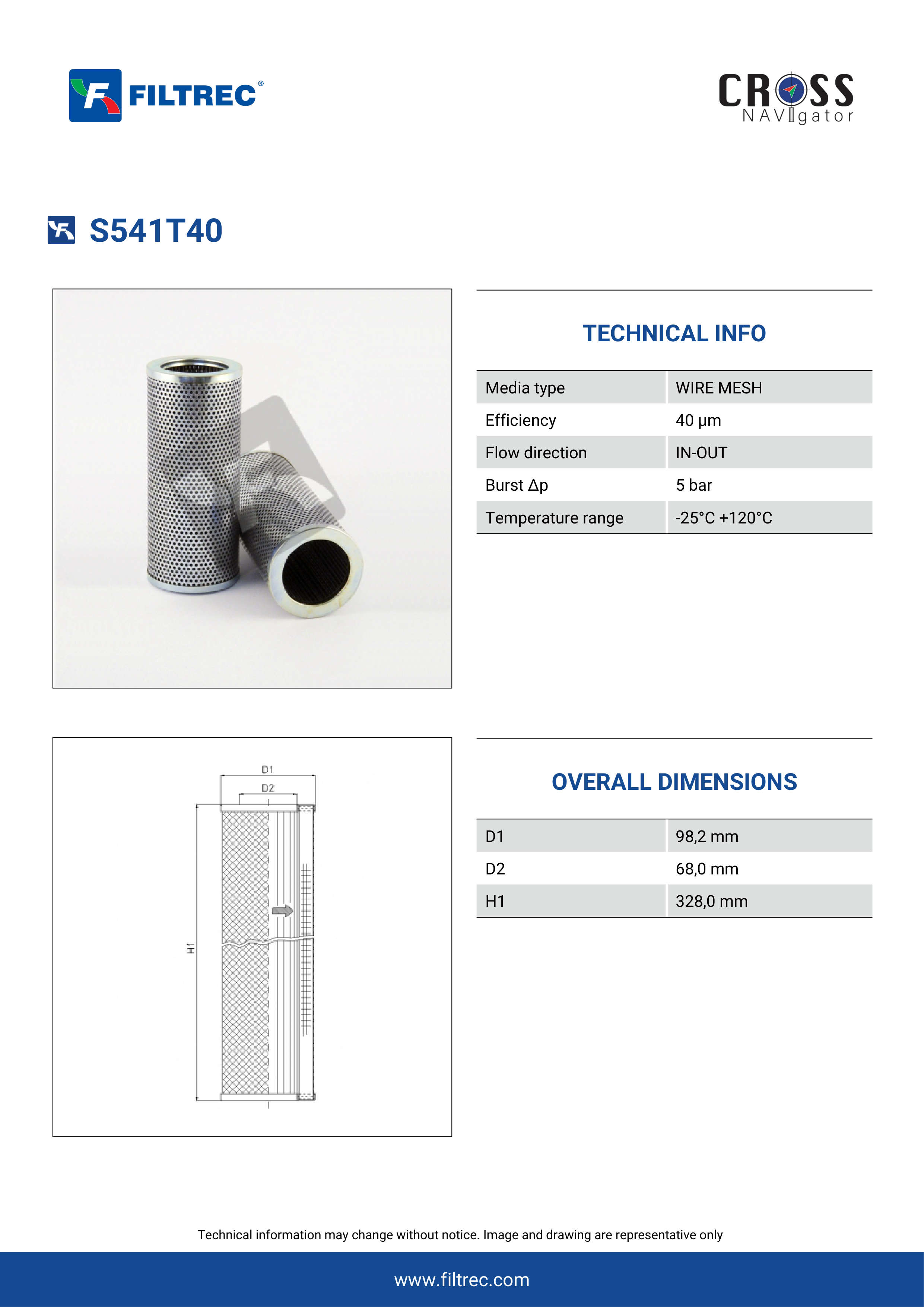 Genuine Filtrec S541T40. This Filtrec element is designed to meet or exceed the quality and performance of brand OEM’s ensuring superior filtration performance and long-lasting durability.