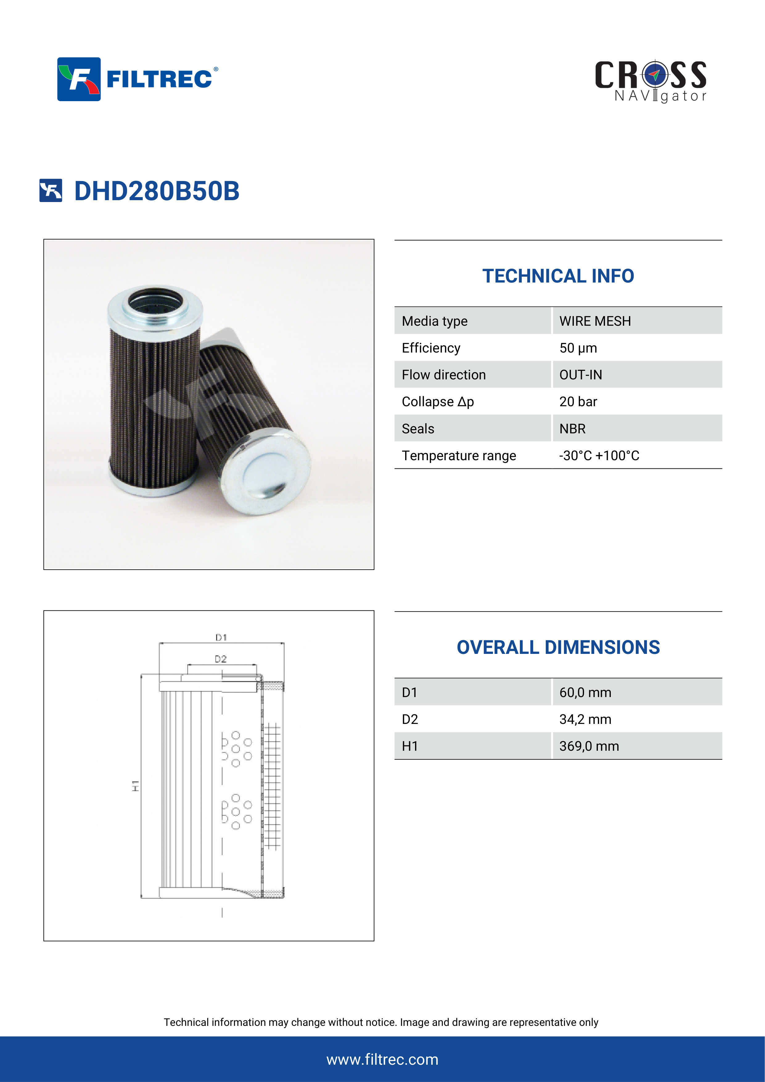 Genuine Filtrec DHD280B50B. This Filtrec element is designed to meet or exceed the quality and performance of brand OEM’s ensuring superior filtration performance and long-lasting durability.Engineered with their high performance media and a durable design, the DHD280B50B provides reliable and consistent performance over its lifespan, even in harsh operating environments. When you order from FilterFinder, you can trust that you are getting a reliable and high-quality replacement filter that will keep your system running smoothly.