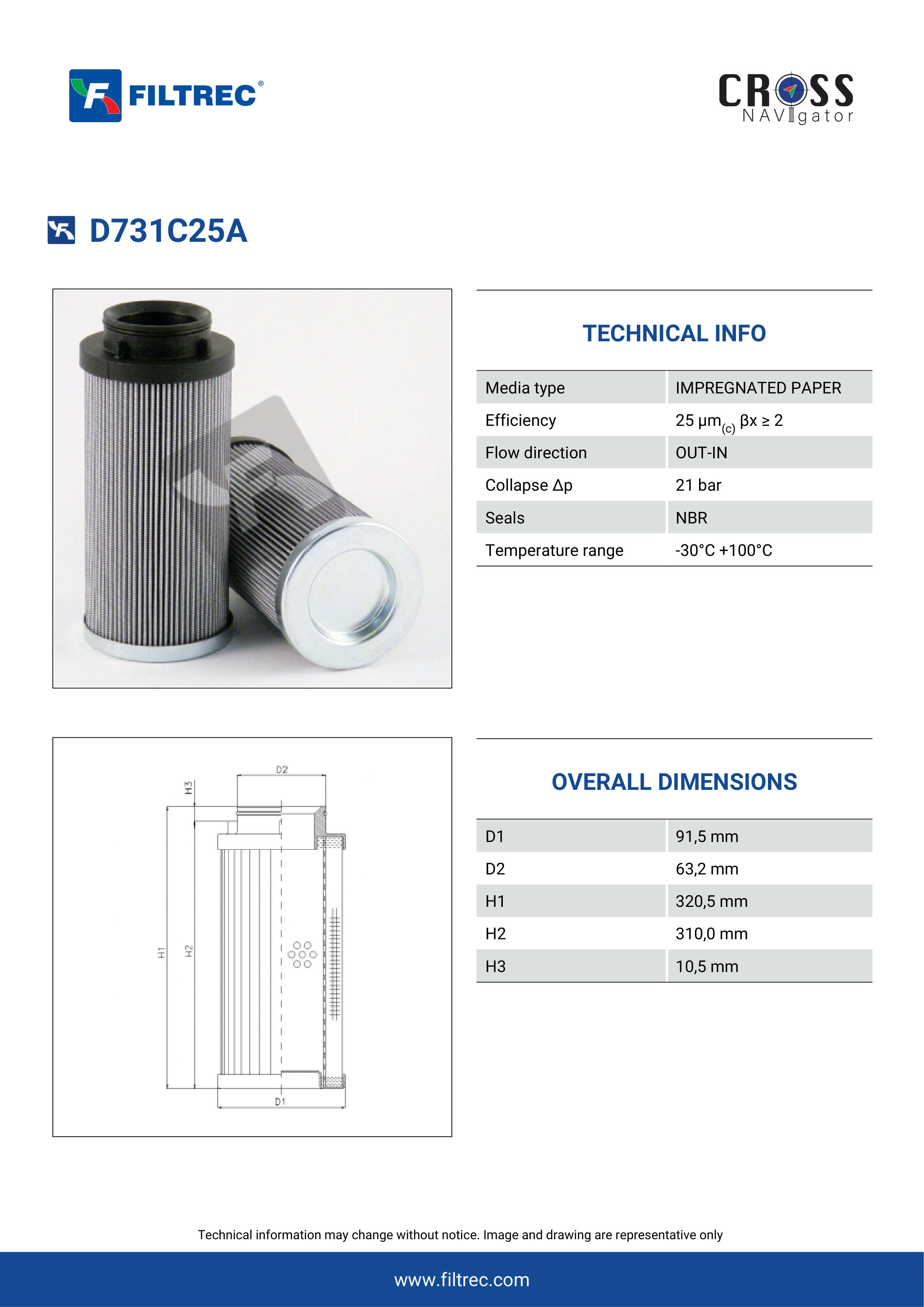 Engineered with their high performance media and a durable design, the D731C25A provides reliable and consistent performance over its lifespan, even in harsh operating environments. When you order from FilterFinder, you can trust that you are getting a reliable and high-quality replacement filter that will keep your system running smoothly.