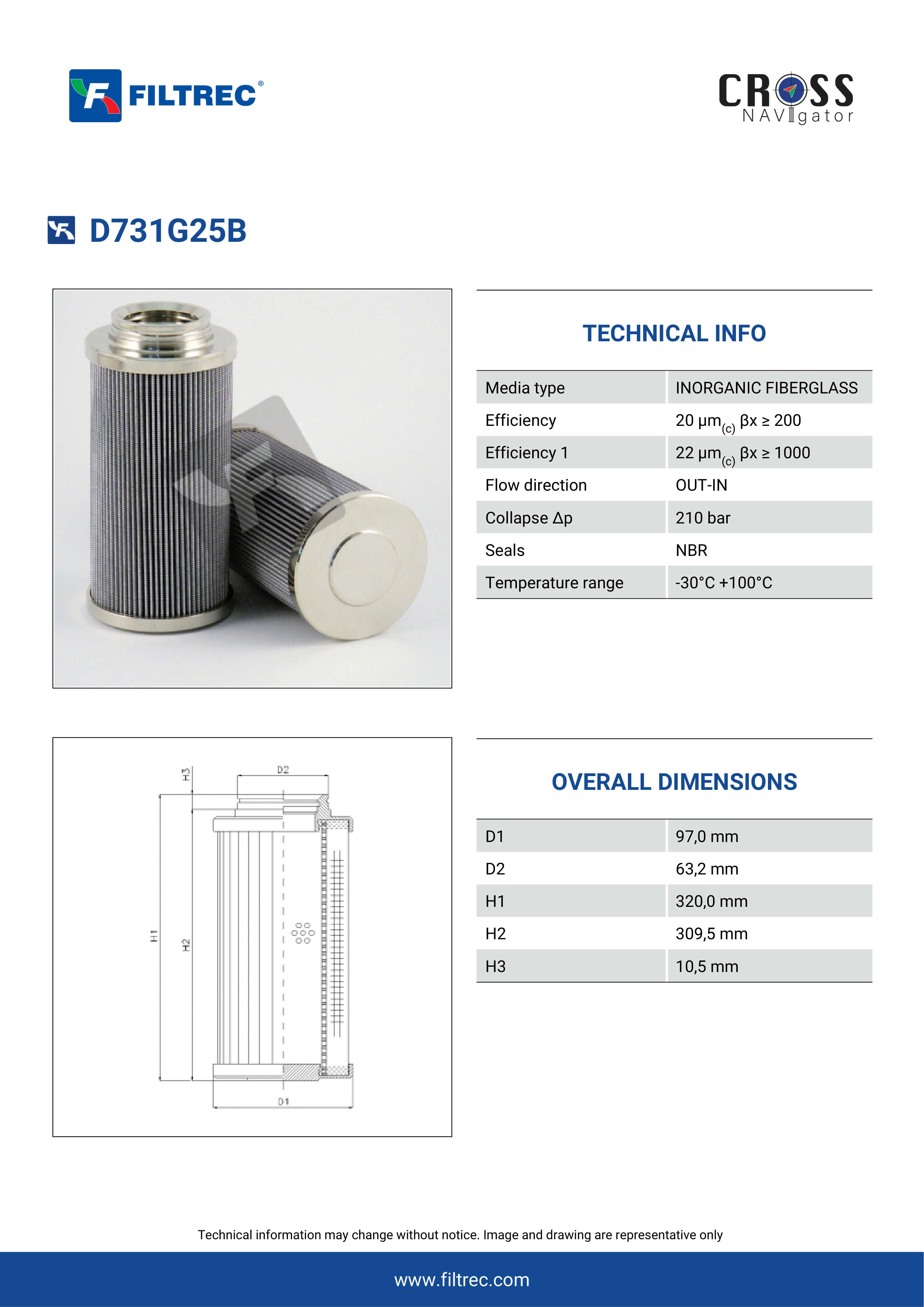 Genuine Filtrec D731G25B. This Filtrec element is designed to meet or exceed the quality and performance of brand OEM’s ensuring superior filtration performance and long-lasting durability.Engineered with their high performance media and a durable design, the D731G25B provides reliable and consistent performance over its lifespan, even in harsh operating environments. When you order from FilterFinder, you can trust that you are getting a reliable and high-quality replacement filter that will keep your system running smoothly.
