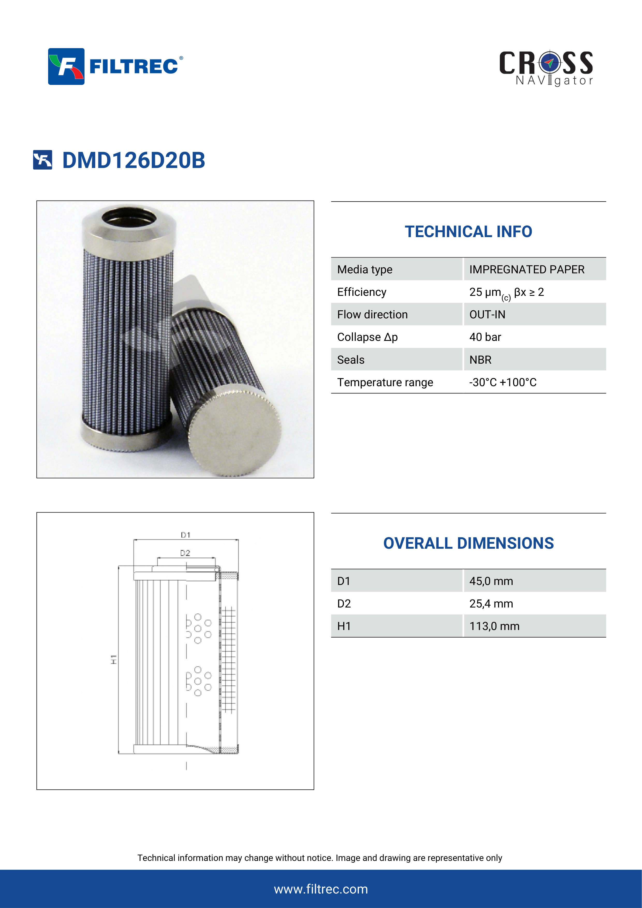 Genuine Filtrec DMD126D20B. This Filtrec element is designed to meet or exceed the quality and performance of brand OEM’s ensuring superior filtration performance and long-lasting durability.Engineered with their high performance media and a durable design, the DMD126D20B provides reliable and consistent performance over its lifespan, even in harsh operating environments. When you order from FilterFinder, you can trust that you are getting a reliable and high-quality replacement filter that will keep your system running smoothly.