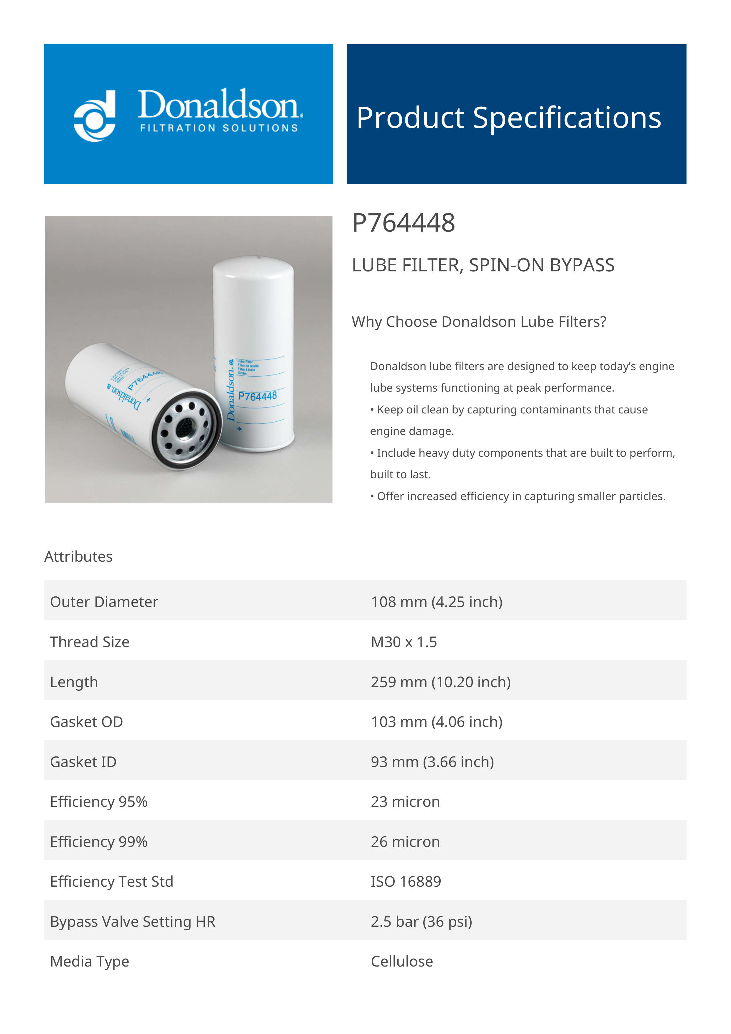 Genuine Donaldson P764448 Lube Filter, Spin-On Bypass is designed to provide reliable performance in lube filter, spin-on bypass applications. Built with high-quality materials, it ensures consistent functionality and durability.