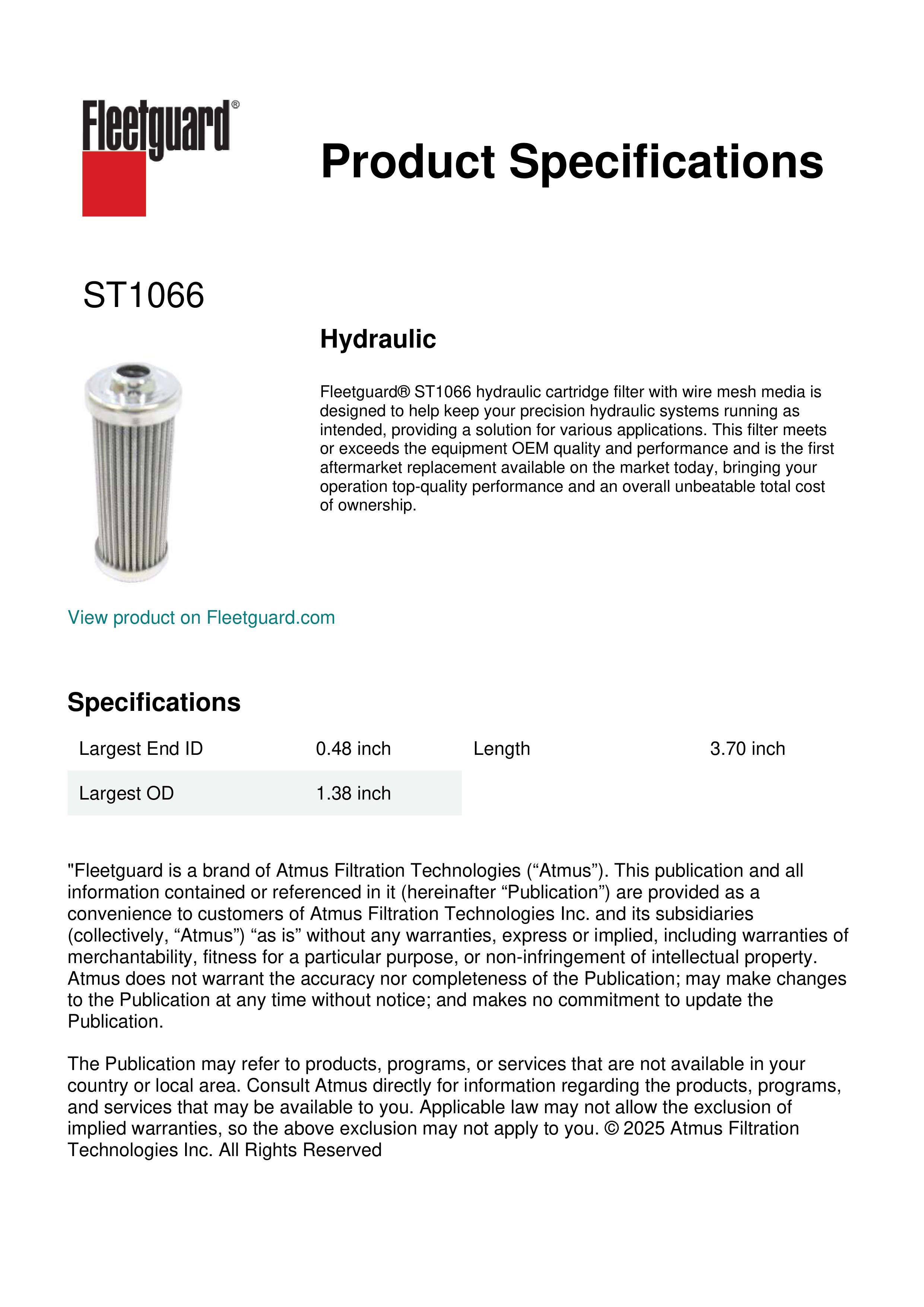 Fleetguard® ST1066 hydraulic cartridge filter with wire mesh media is designed to help keep your precision hydraulic systems running as intended, providing a solution for various applications. This filter meets or exceeds the equipment OEM quality and performance and is the first aftermarket replacement available on the market today, bringing your operation top-quality performance and an overall unbeatable total cost of ownership.Specification