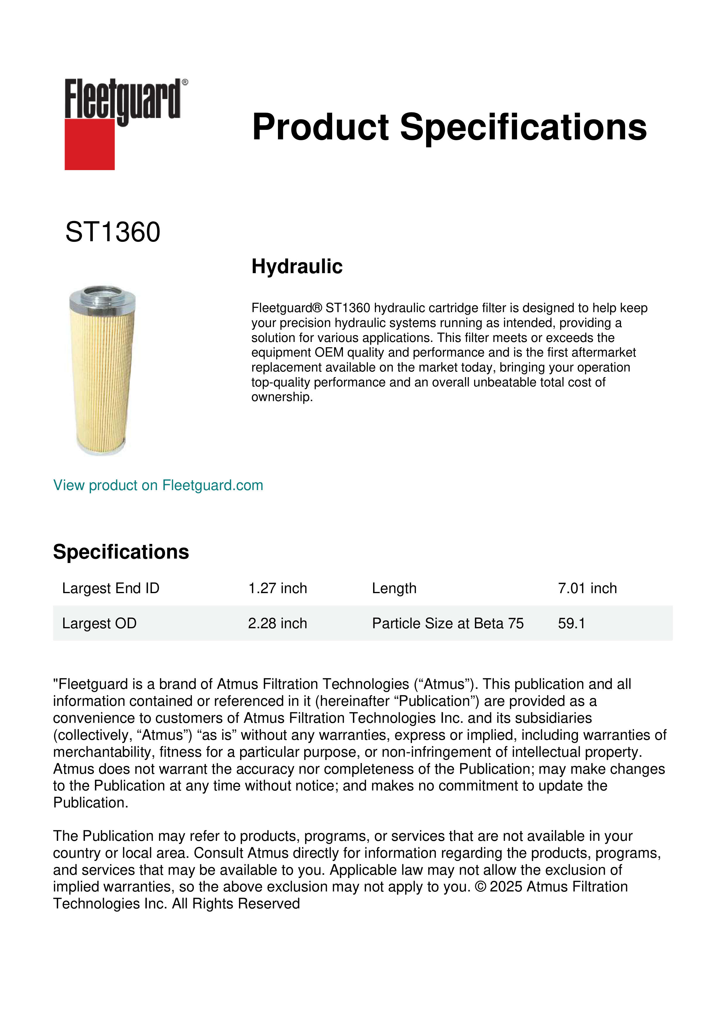 Fleetguard® ST1360 hydraulic cartridge filter is designed to help keep your precision hydraulic systems running as intended, providing a solution for various applications. This filter meets or exceeds the equipment OEM quality and performance and is the first aftermarket replacement available on the market today, bringing your operation top-quality performance and an overall unbeatable total cost of ownership.Specification