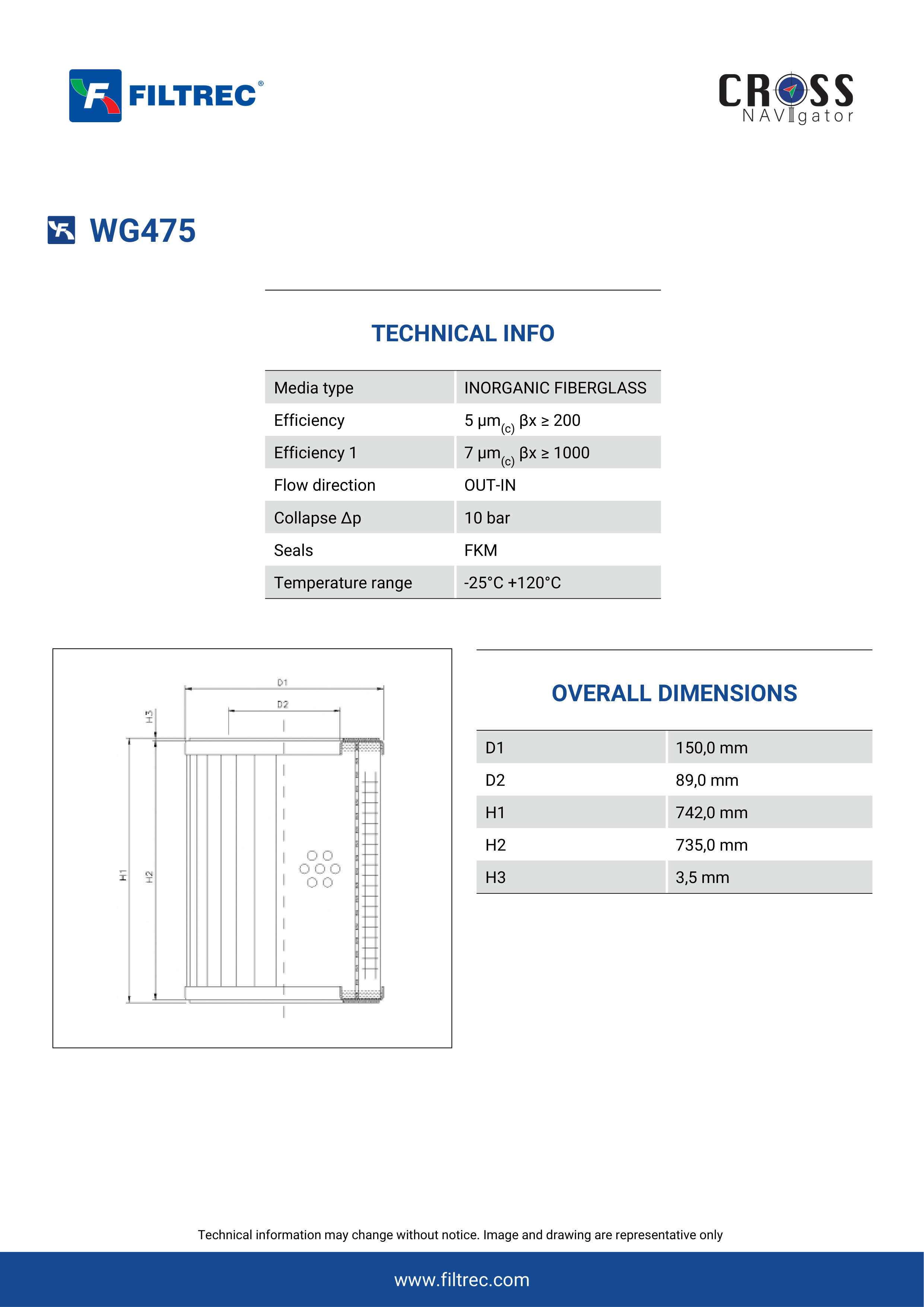 The efficiency of the element is shown using the Micron (µ) and Beta (β) ratings. The micron rating indicates the size of the particle being filtered and the beta rating the efficiency, calculated as 1/β.