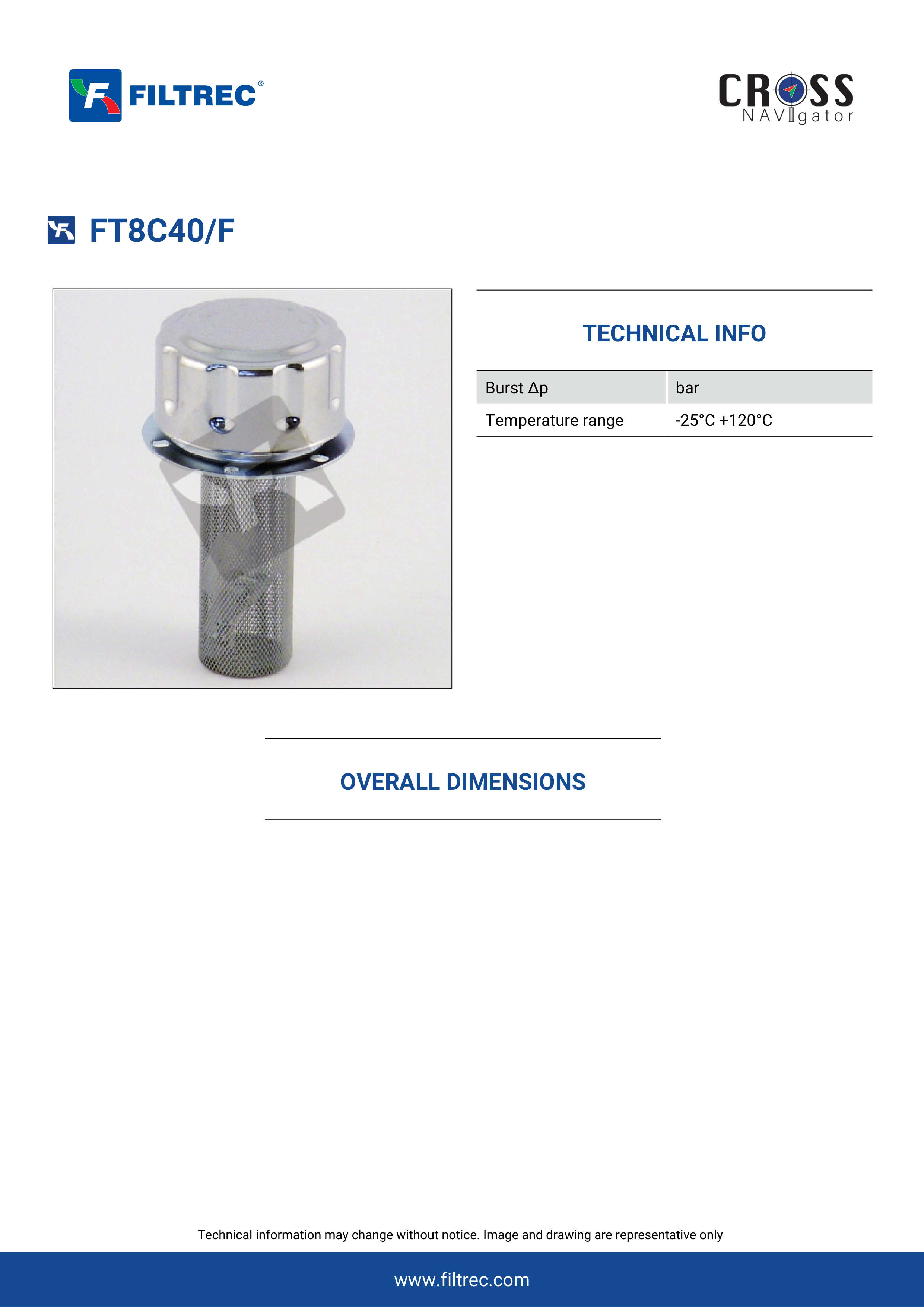 Genuine Filtrec FT8C40/F. This Filtrec element is designed to meet or exceed the quality and performance of brand OEM’s ensuring superior filtration performance and long-lasting durability.Engineered with their high performance media and a durable design, the FT8C40/F provides reliable and consistent performance over its lifespan, even in harsh operating environments. When you order from FilterFinder, you can trust that you are getting a reliable and high-quality replacement filter that will keep your system running smoothly.
