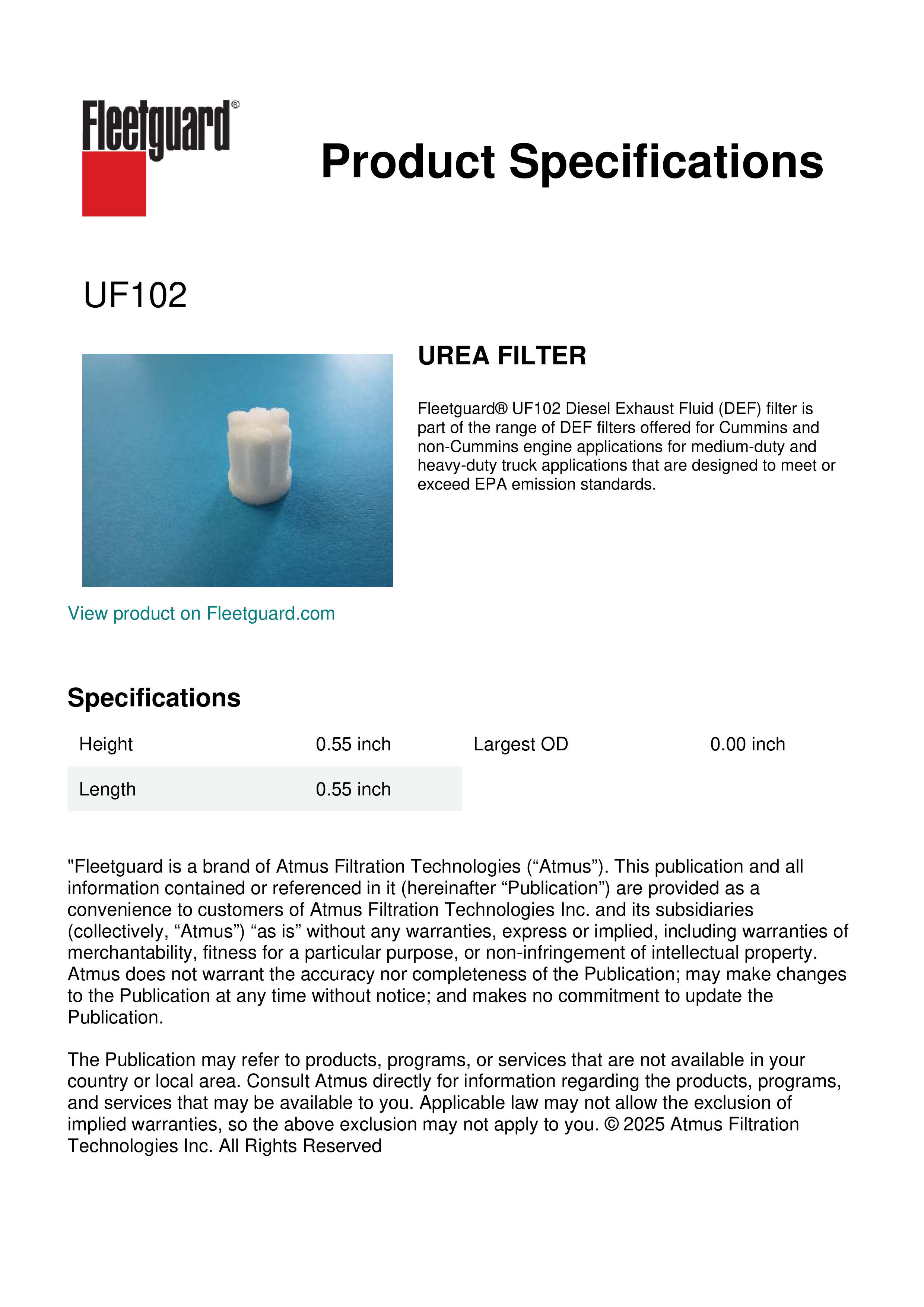 Fleetguard® UF102 Diesel Exhaust Fluid (DEF) filter is part of the range of DEF filters offered for Cummins and non-Cummins engine applications for medium-duty and heavy-duty truck applications that are designed to meet or exceed EPA emission standards.Specification