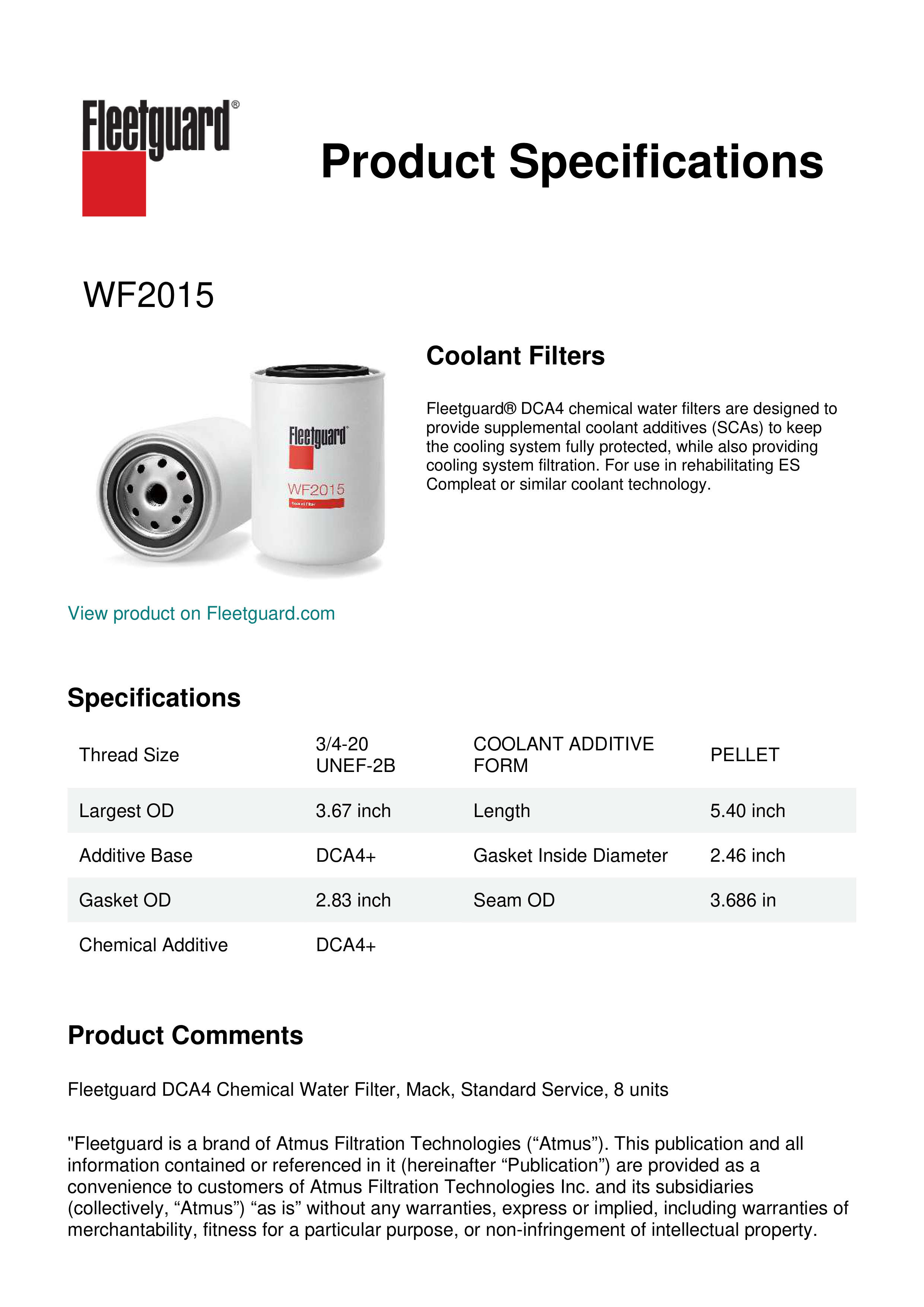 Choose Fleetguard® WF2015 is a chemical additive water filter for coolant system protection that provides filtration only. Chemical additive water filters are designed for use with OAT technology (which doesn't require DCA's for maintenance) or Hybrid and Conventional systems using liquid DCA's for reinhibition.Specification
