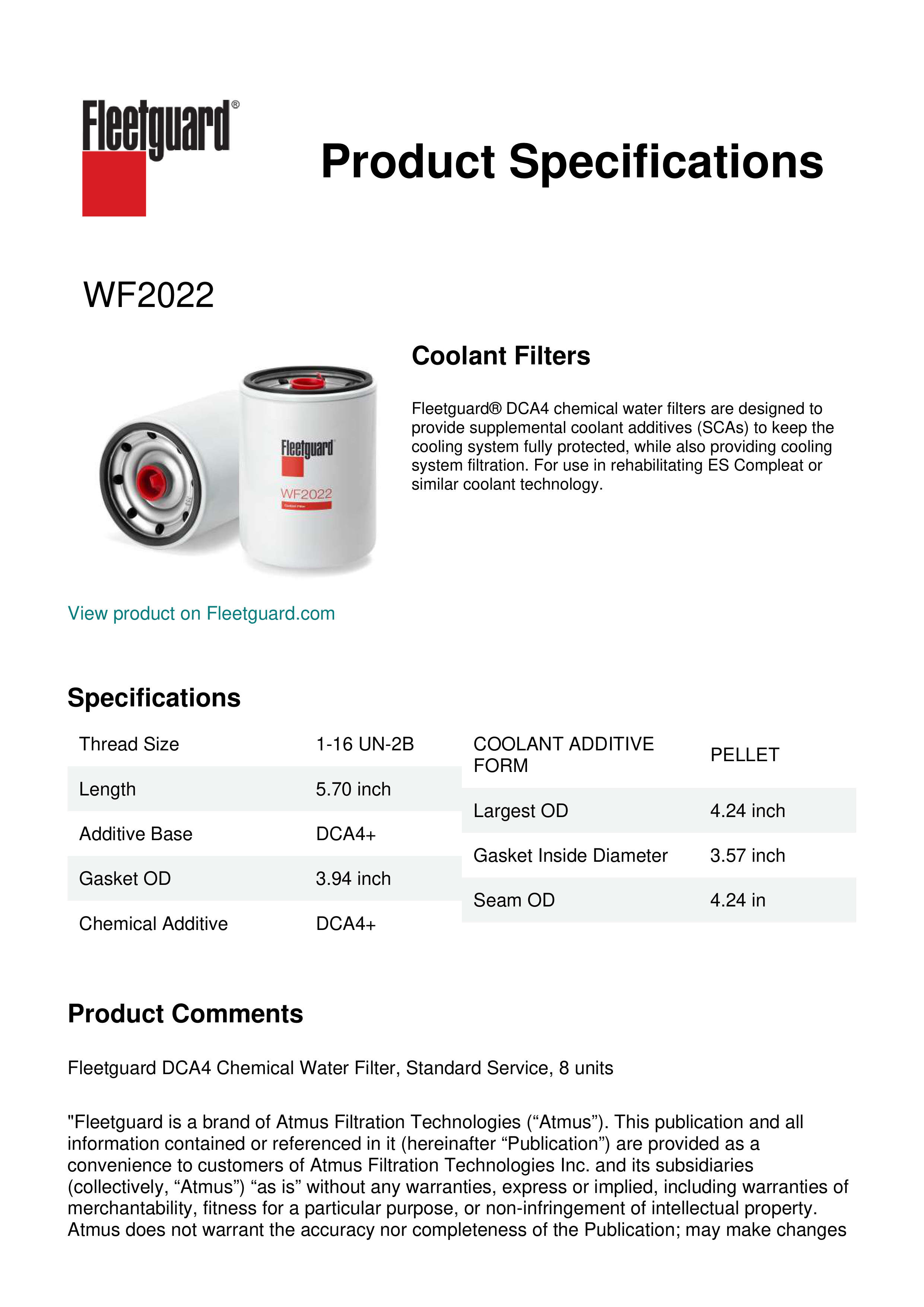 Choose Fleetguard® WF2022 DCA4 water filters with chemicals for coolant system protection that provides filtration and additive reinhibition. DCA4 water filters are designed for use with ES Compleat or similar coolant technology.Specification