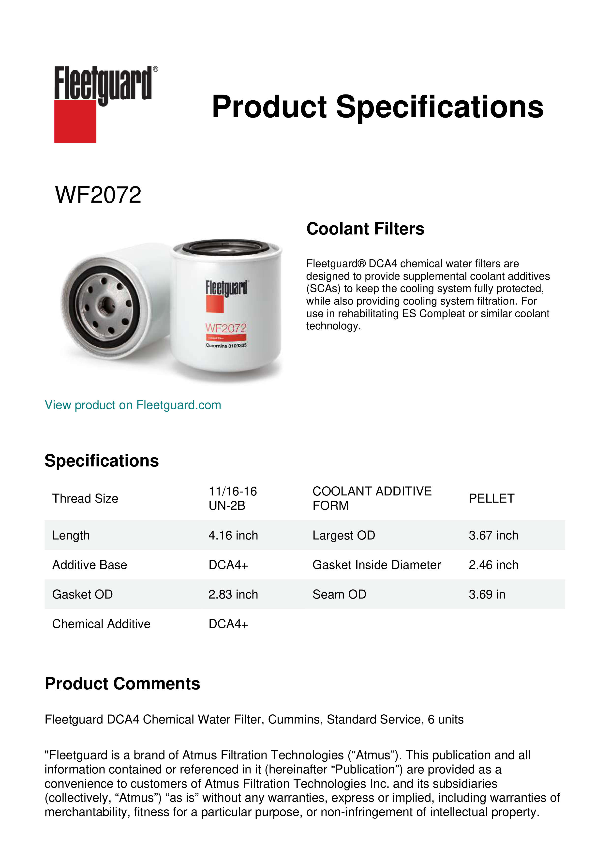 Choose Fleetguard® WF2072 DCA4 water filters with chemicals for coolant system protection that provides filtration and additive reinhibition. DCA4 water filters are designed for use with ES Compleat or similar coolant technology.Specification