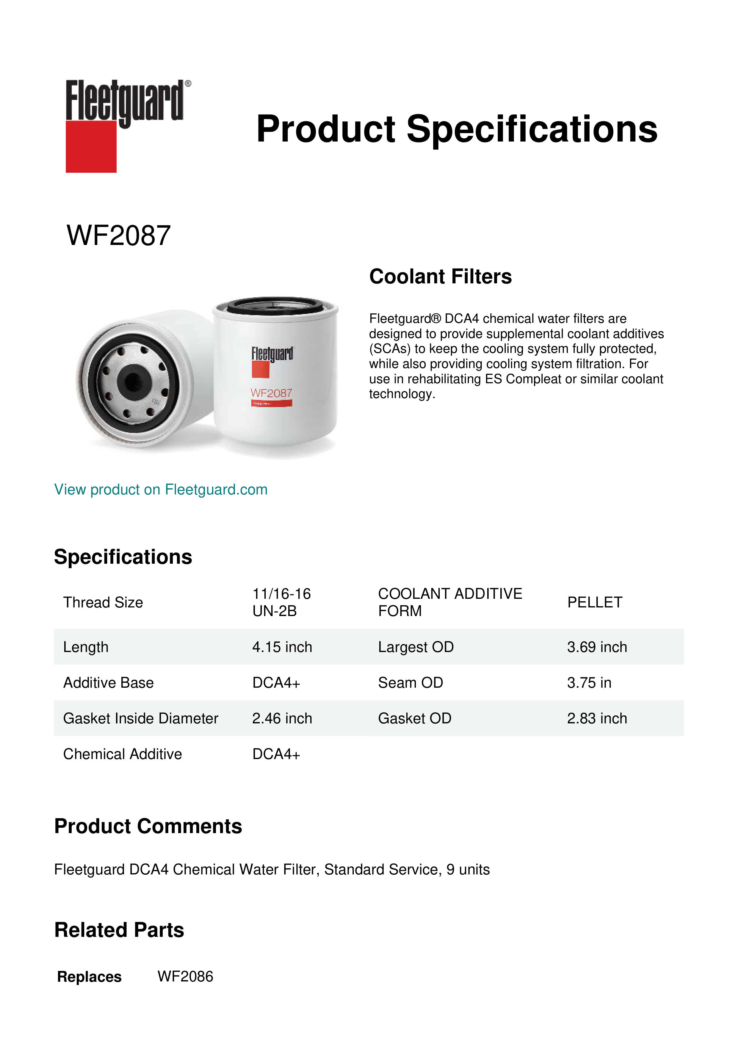Fleetguard® WF2087 premium water spin-on filter with cellulose media provides a convenient and reliable method for delivering immediate release DCA2 additive into the cooling system to improve performance and extend coolant service life.