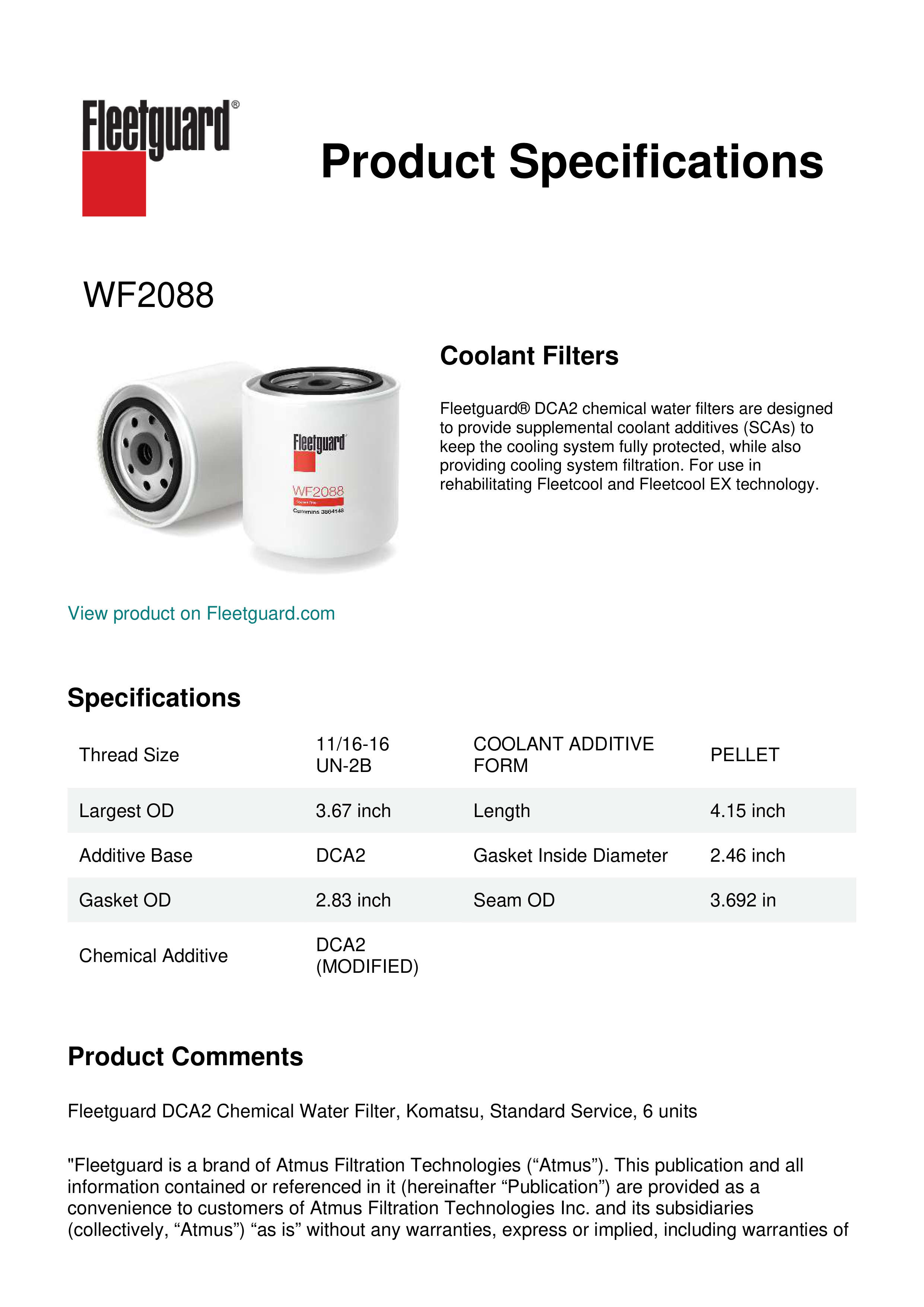 Choose Fleetguard® WF2088 DCA2 water filter with chemicals for coolant system protection that provides filtration and additive reinhibition. DCA2 water filters are designed for use with Fleetcool, Fleetcool EX or similar technology.Specification