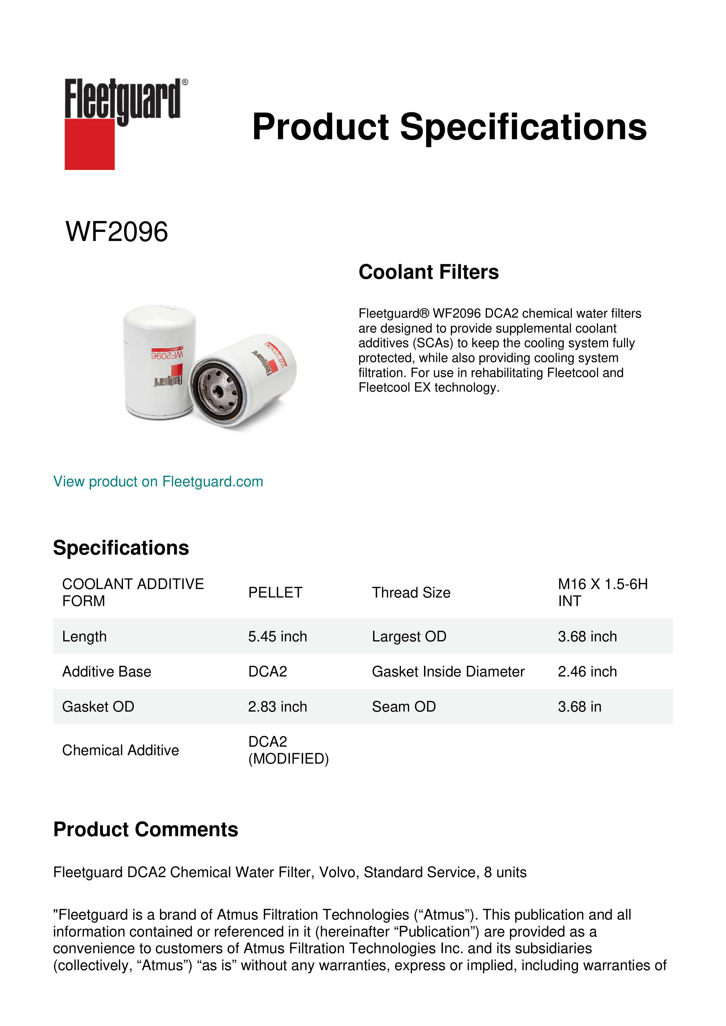 Choose Fleetguard® WF2096 non-chemical water filter for coolant system protection that provides filtration only. Non-chemical water filters are designed for use with OAT technology (which doesn't require DCA's for maintenance) or Hybrid and Conventional systems using liquid DCA's for reinhibition.Specification
