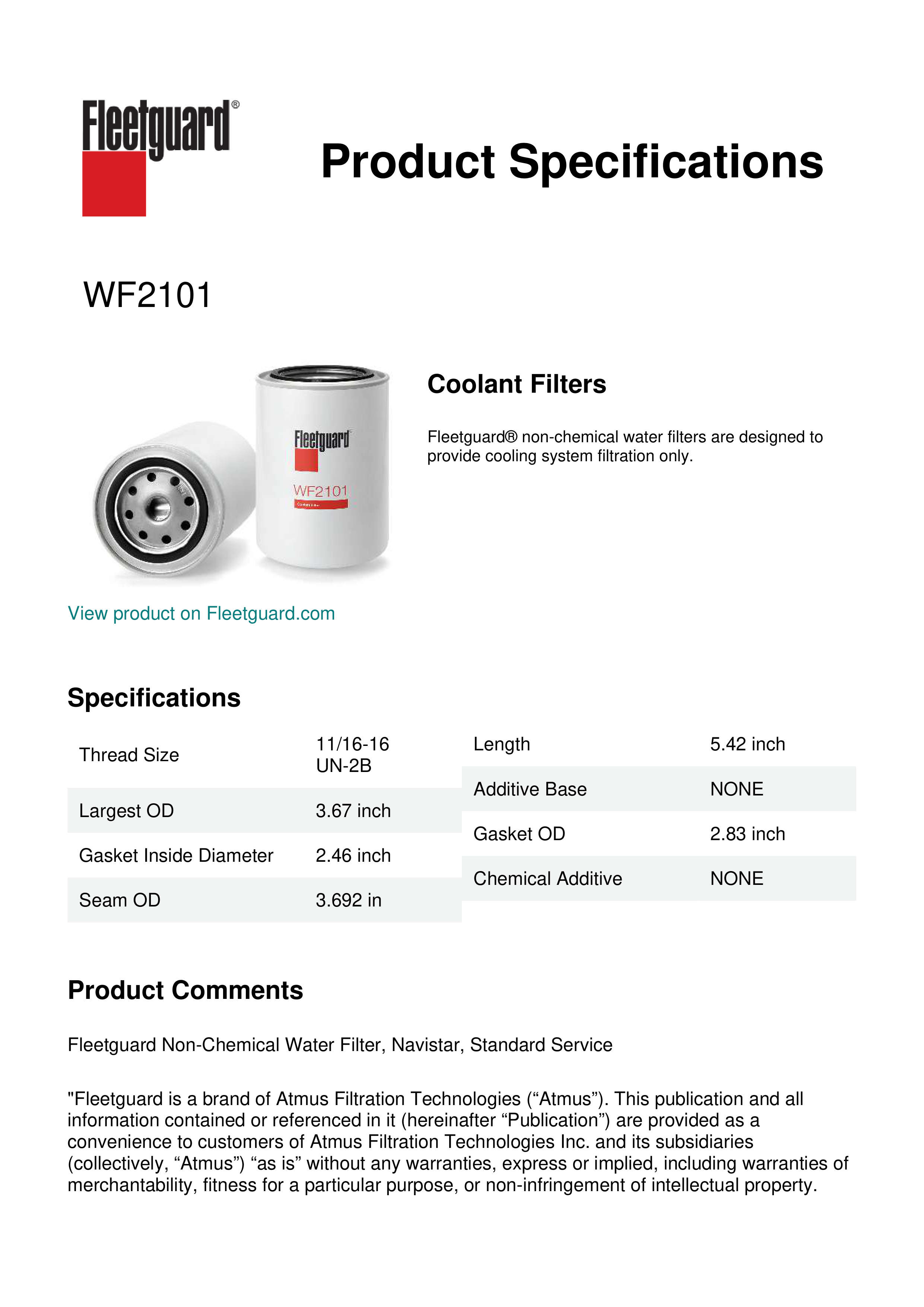 Choose Fleetguard® WF2101 non-chemical water filter with chemicals for coolant system protection that provides filtration only. Non-chemical water filters are designed for use with OAT technology (which doesn't require DCA's for maintenance) or Hybrid and Conventional systems using liquid DCA's for reinhibition.Specification