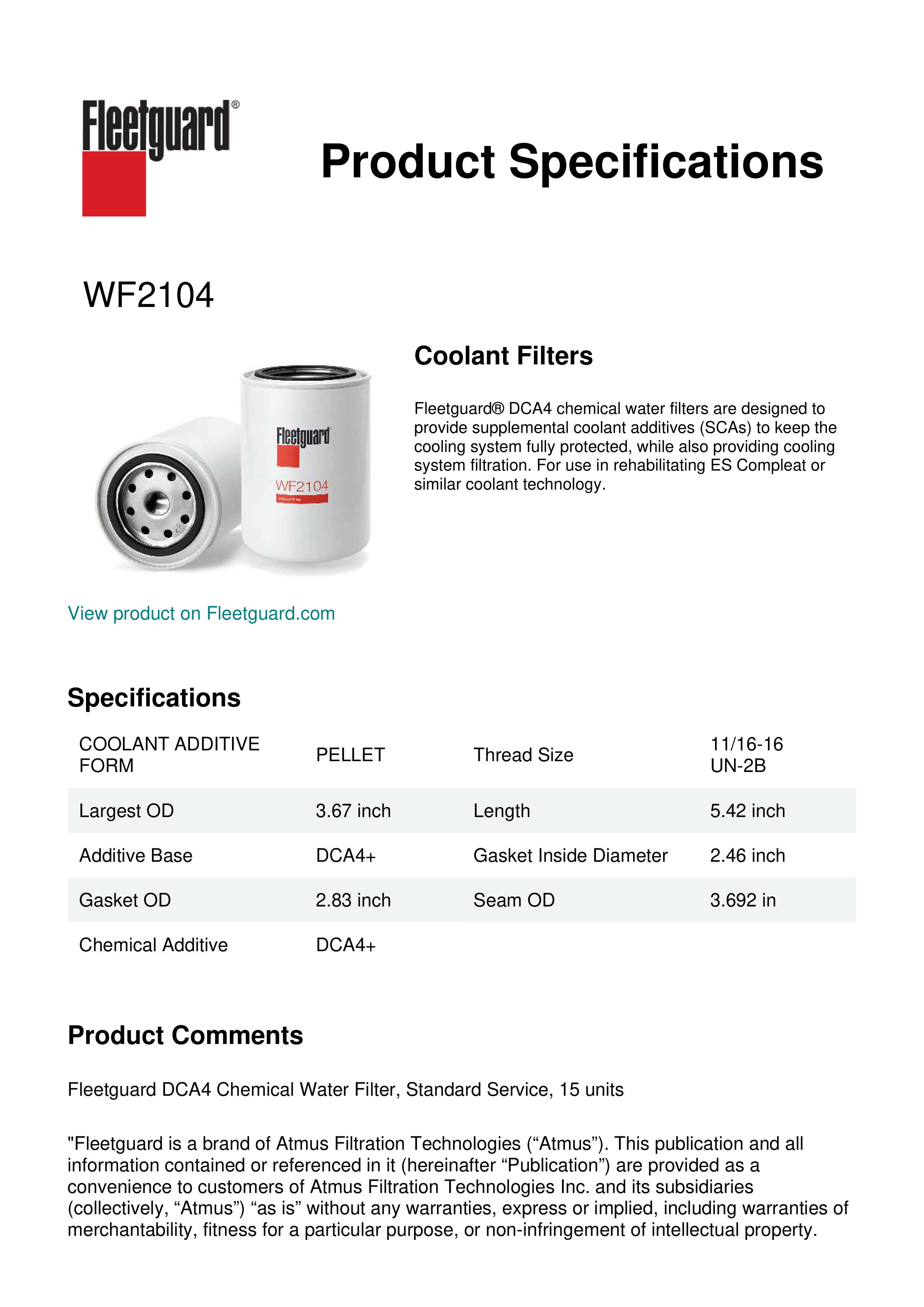 Choose Fleetguard® WF2104 non-chemical water filter with chemicals for coolant system protection that provides filtration only. Non-chemical water filters are designed for use with OAT technology (which doesn't require DCA's for maintenance) or Hybrid and Conventional systems using liquid DCA's for reinhibition.Specification