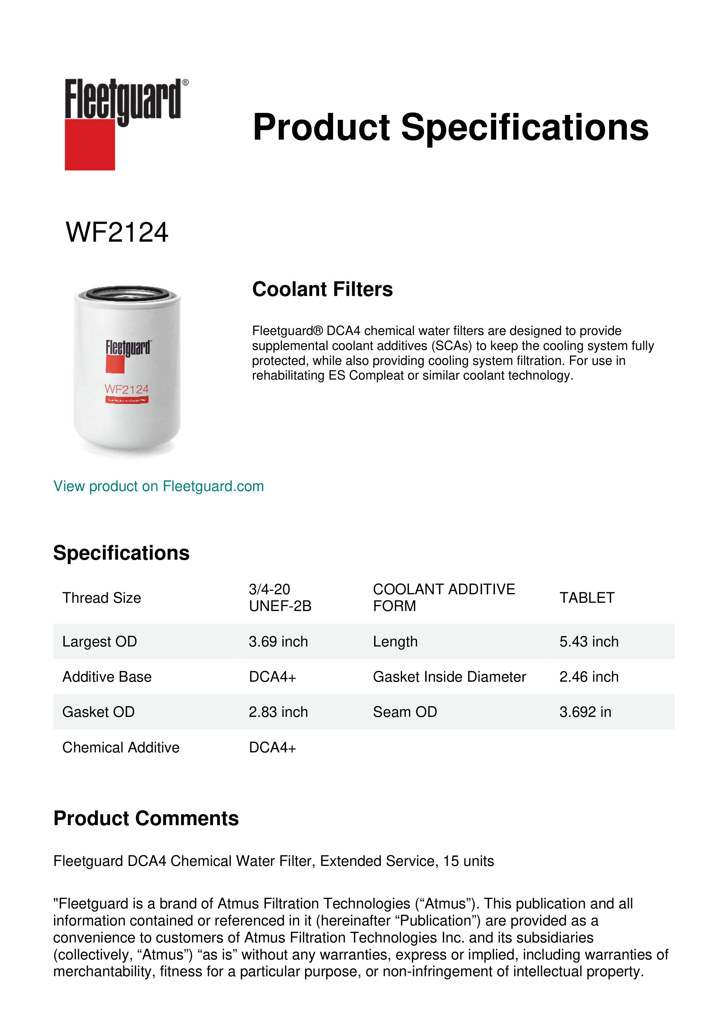 Choose Fleetguard® WF2124 DCA4 water filters with chemicals for coolant system protection that provides filtration and additive reinhibition. DCA4 water filters are designed for use with ES Compleat or similar coolant technology.Specification