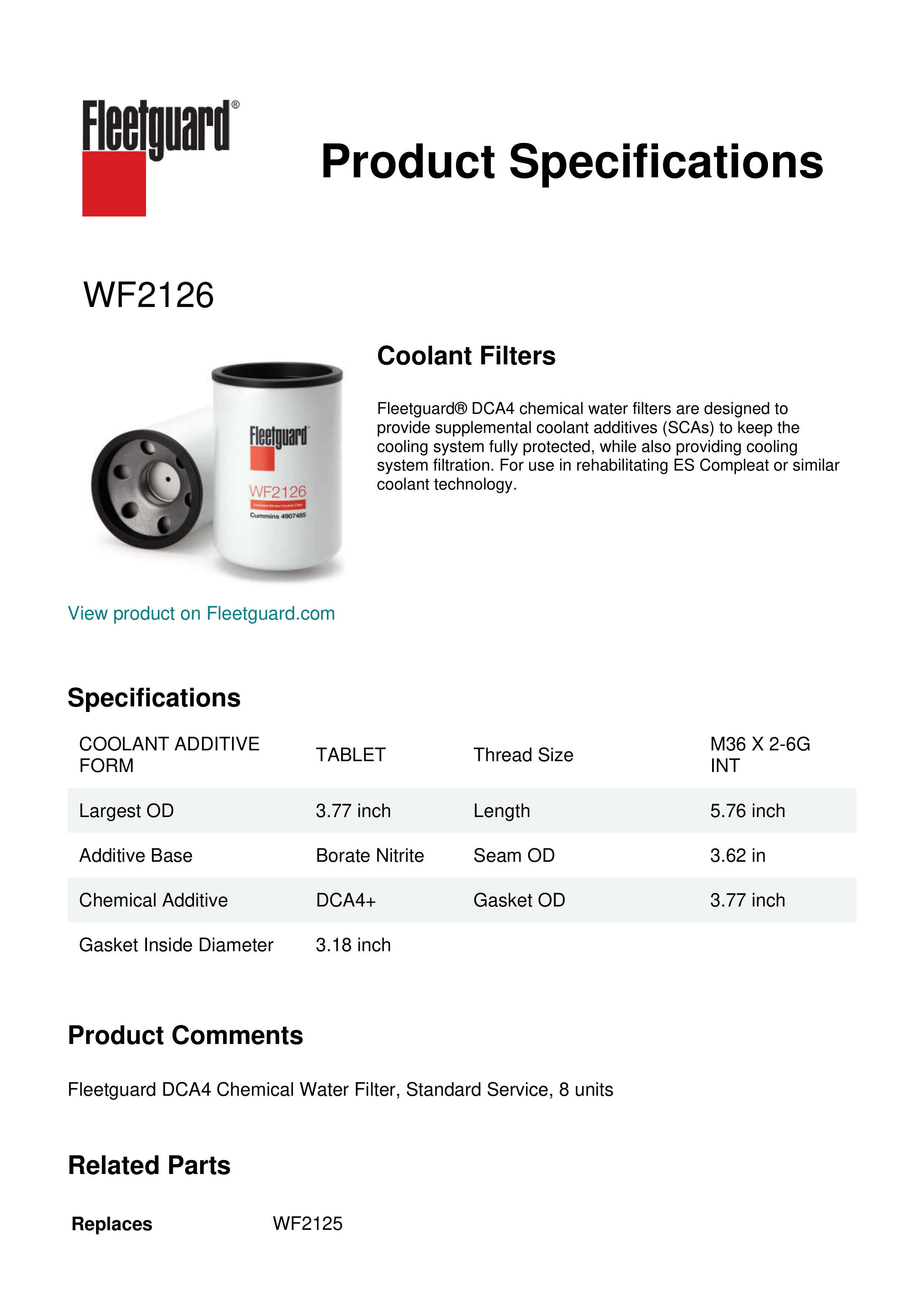 Choose Fleetguard® WF2126 non-chemical water filter for coolant system protection that provides filtration only. Non-chemical water filters are designed for use with OAT technology (which doesn't require DCA's for maintenance) or Hybrid and Conventional systems using liquid DCA's for reinhibition.Specification