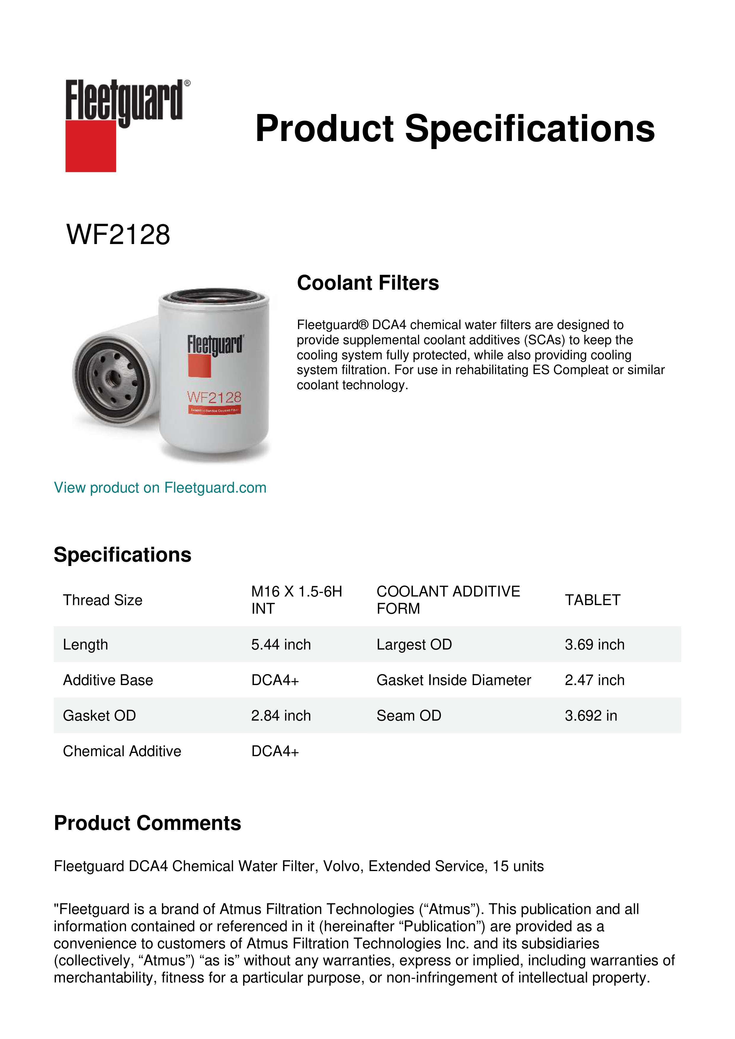 Choose Fleetguard® WF2128 DCA4 water filters with chemicals for coolant system protection that provides filtration and additive reinhibition. DCA4 water filters are designed for use with ES Compleat or similar coolant technology.Specification