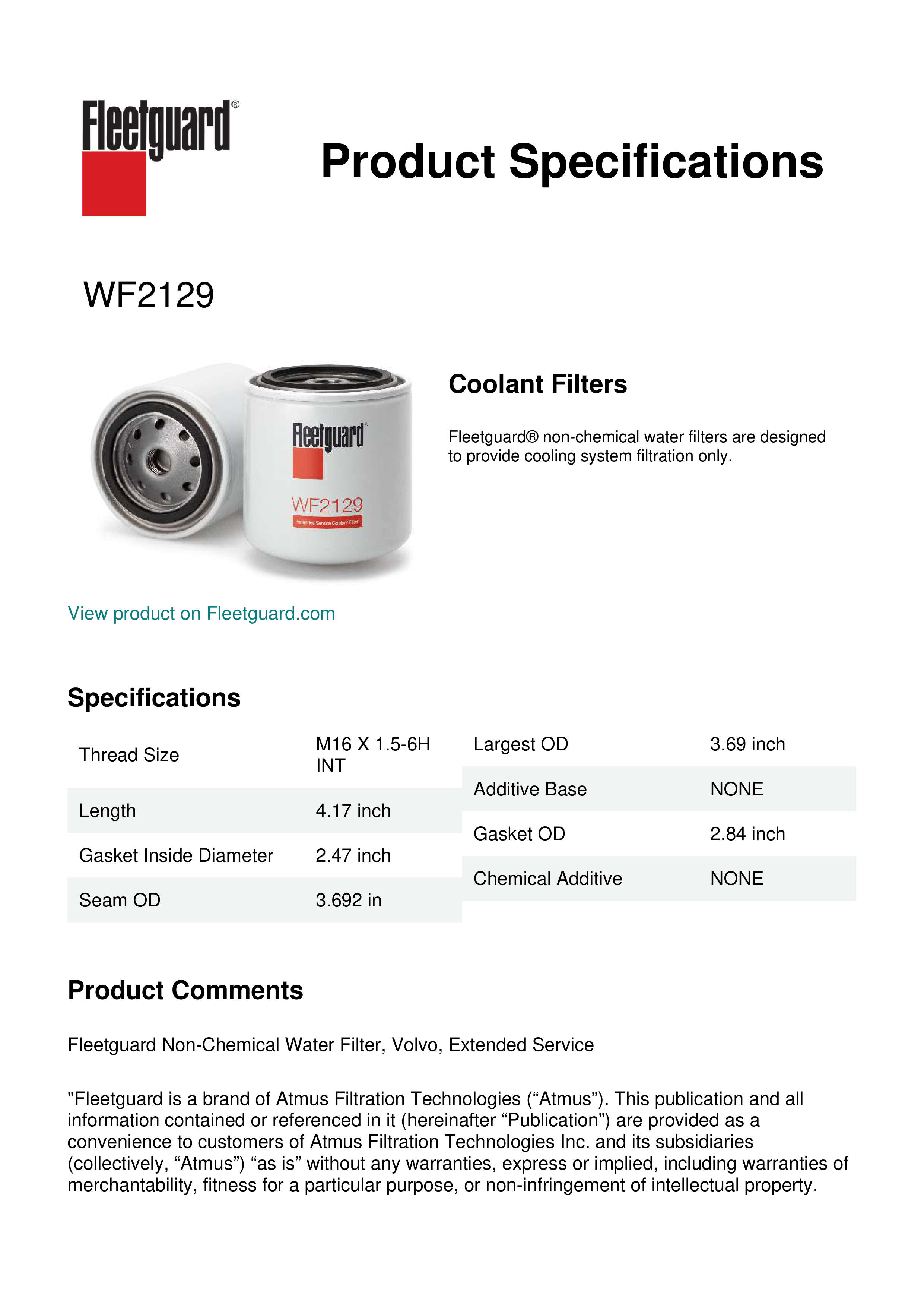 Choose Fleetguard® WF2129 non-chemical water filter with chemicals for coolant system protection that provides filtration only. Non-chemical water filters are designed for use with OAT technology (which doesn't require DCA's for maintenance) or Hybrid and Conventional systems using liquid DCA's for reinhibition.Specification