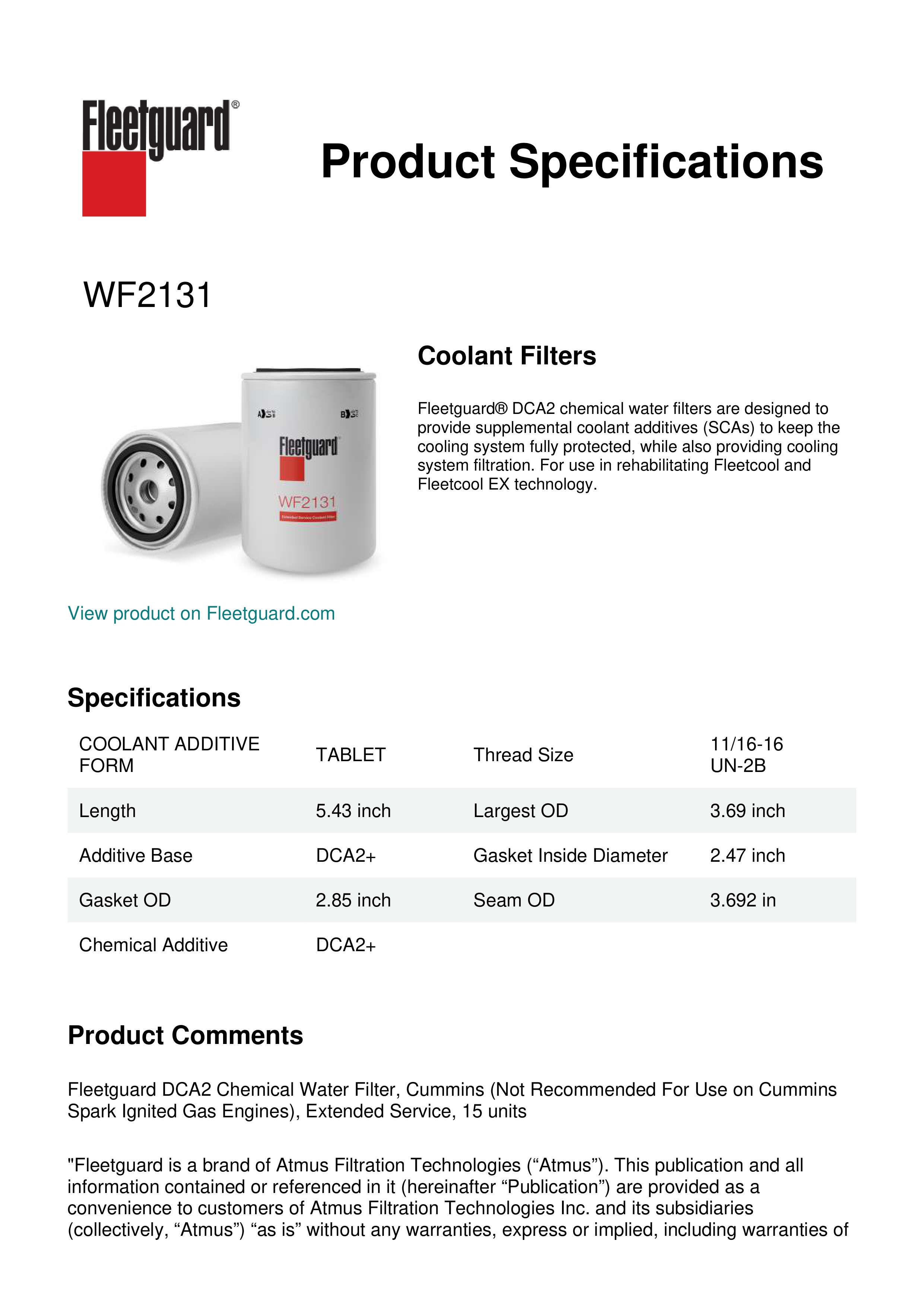 Choose Fleetguard® WF2131 DCA2 water filter with chemicals for coolant system protection that provides filtration and additive reinhibition. DCA2 water filters are designed for use with Fleetcool, Fleetcool EX or similar technology.Specification