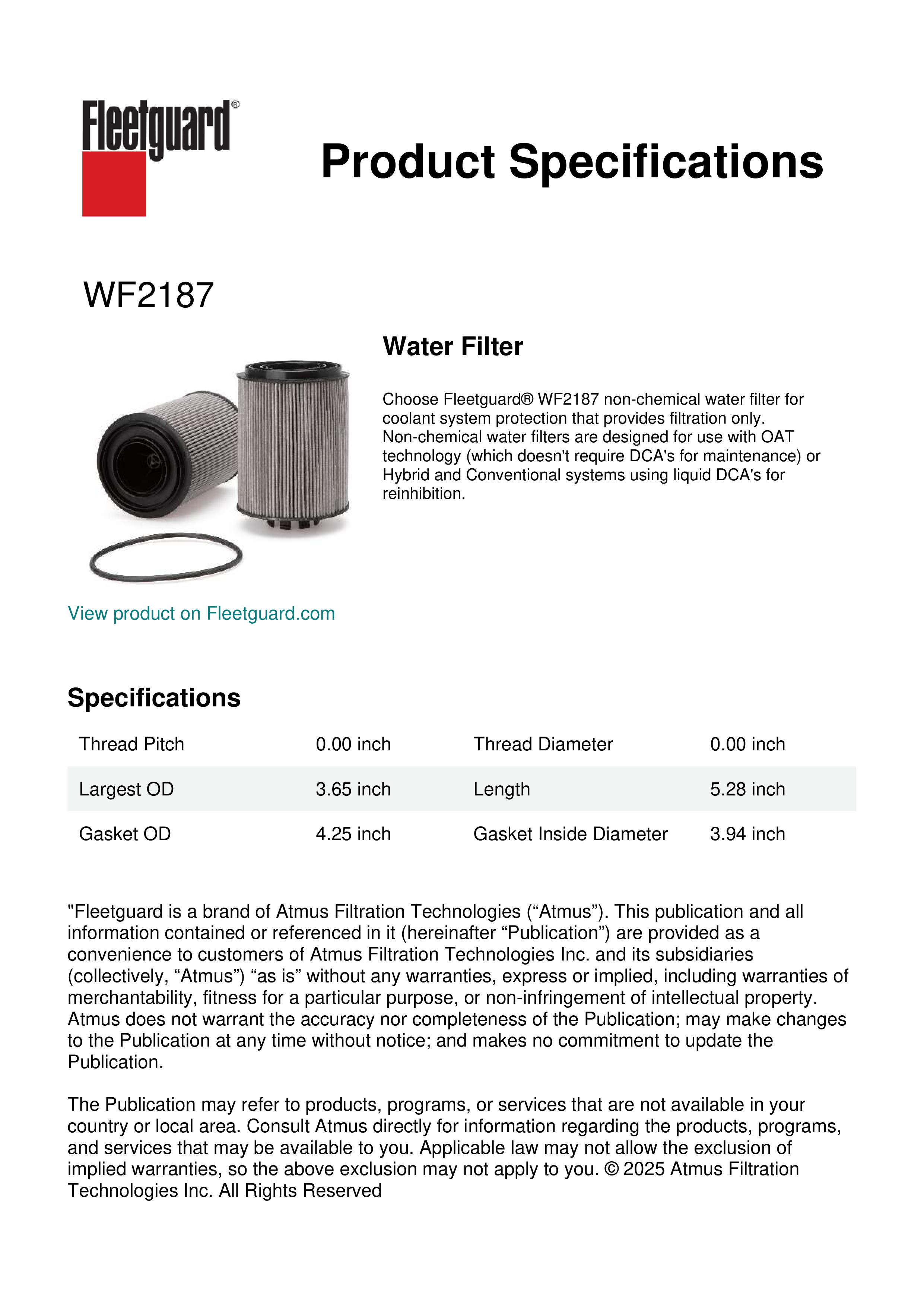 Choose Fleetguard® WF2187 non-chemical water filter for coolant system protection that provides filtration only. Non-chemical water filters are designed for use with OAT technology (which doesn't require DCA's for maintenance) or Hybrid and Conventional systems using liquid DCA's for reinhibition.Specification