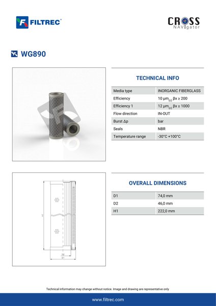 Genuine Filtrec WG890. This Filtrec element is designed to meet or exceed the quality and performance of brand OEM’s ensuring superior filtration performance and long-lasting durability.