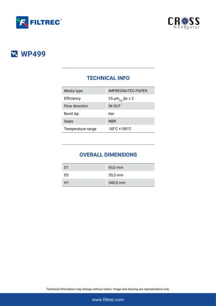 Genuine Filtrec WP499. This Filtrec element is designed to meet or exceed the quality and performance of brand OEM’s ensuring superior filtration performance and long-lasting durability.