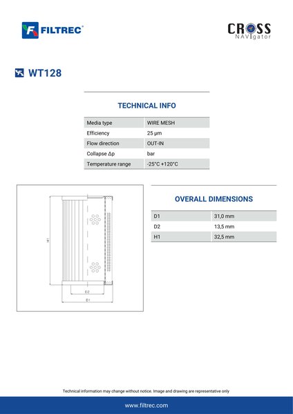 Genuine Filtrec WT128. This Filtrec element is designed to meet or exceed the quality and performance of brand OEM’s ensuring superior filtration performance and long-lasting durability.