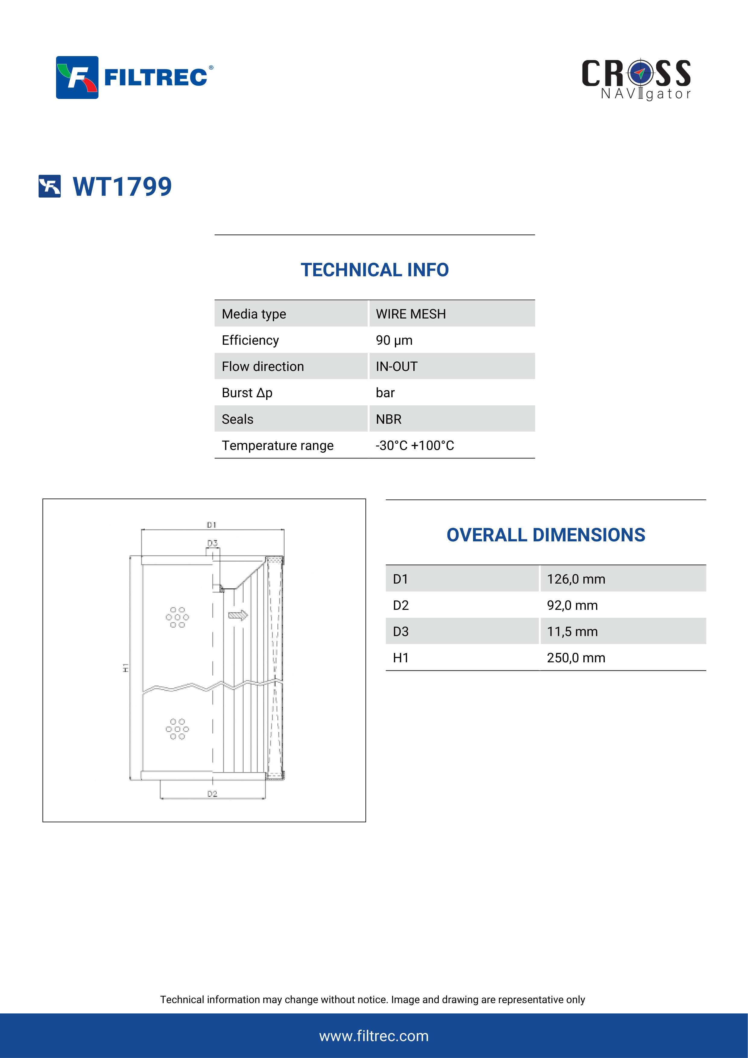 Genuine Filtrec WT1799. This Filtrec element is designed to meet or exceed the quality and performance of brand OEM’s ensuring superior filtration performance and long-lasting durability.