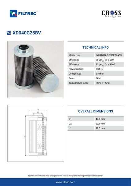 Genuine Filtrec XD040G25BV. This Filtrec element is designed to meet or exceed the quality and performance of brand OEM’s ensuring superior filtration performance and long-lasting durability.