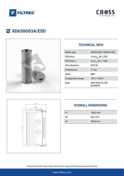 Genuine Filtrec XD630G03A/ESD. This Filtrec element is designed to meet or exceed the quality and performance of brand OEM’s ensuring superior filtration performance and long-lasting durability.